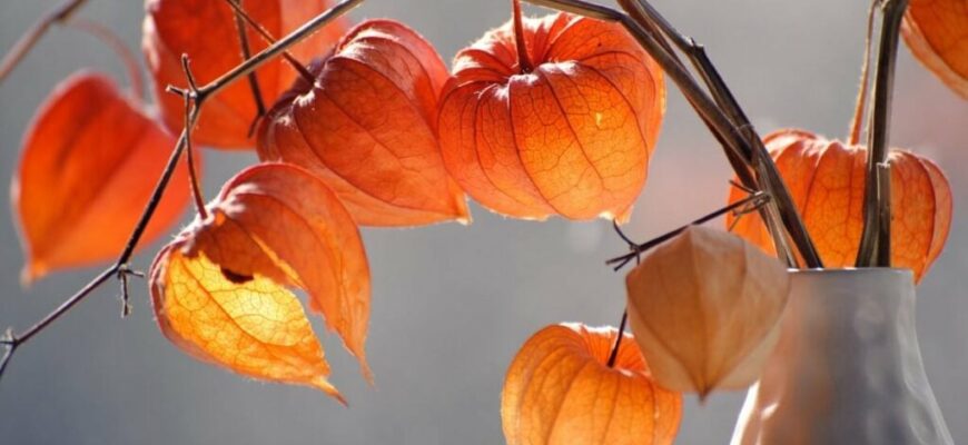 Китайские фонарики (Alkekengi officinarum) не дают самых примечательных цветов, но их очень любят за их декоративные чашечки, в которых находятся плоды