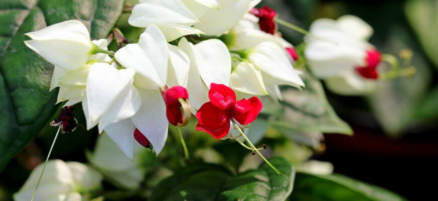 Клеродендрум (лиана кровоточащего сердца) Glorybower, мешок цветок, и виноградная лоза с кровоточащим сердцем — некоторые из его распространенных названий.