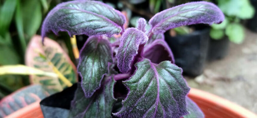 Бархатное растение (Джинура аурантиака) Известный как Фиолетовое растение страсти или Джинура аурантиакафиолетовый бархатное растение имеет фиолетовые