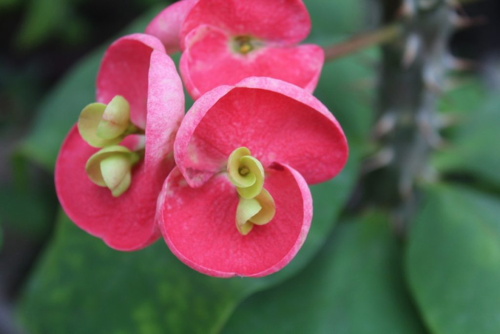 Вы можете увидеть розовые прицветники выше на Молочай Мили или терновый венец и ниже на пуансеттии. Маленькие желтые цветки находятся в середине прицветников пуансеттии. Молочай пульчеррима и все это называется циатиум.