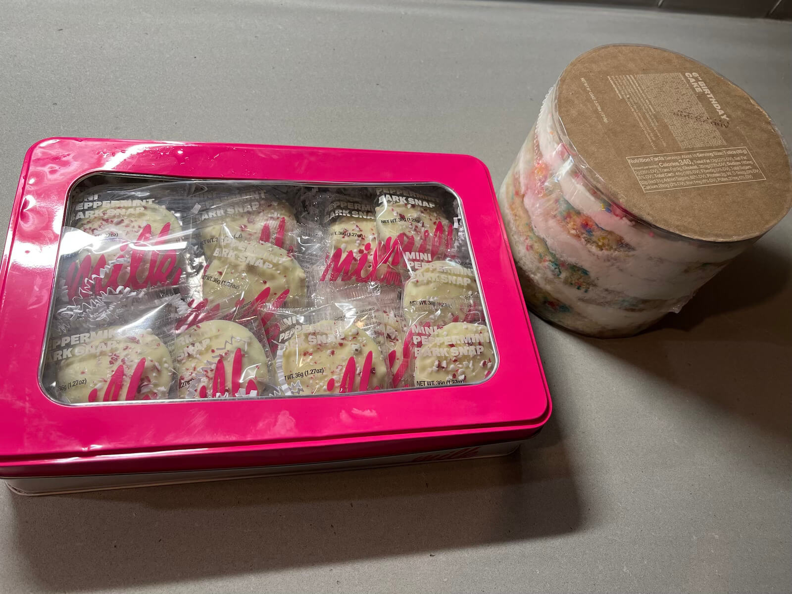 Mini Peppermint Bark Snap Tin предлагает многослойное печенье из карамели, кренделя, вафли из темного шоколада, покрытое белым шоколадом и посыпанное мятой. Каждое печенье упаковано в индивидуальную упаковку и аккуратно упаковано в розовую жестяную банку с логотипом Milk Bar.